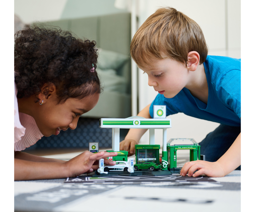 - Stazione di servizio BP in scala giocattolo con pompa di benzina, colonnina elettrica e autolavaggio.