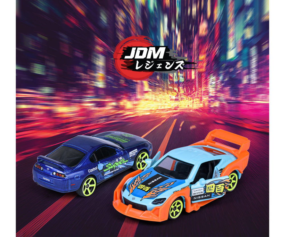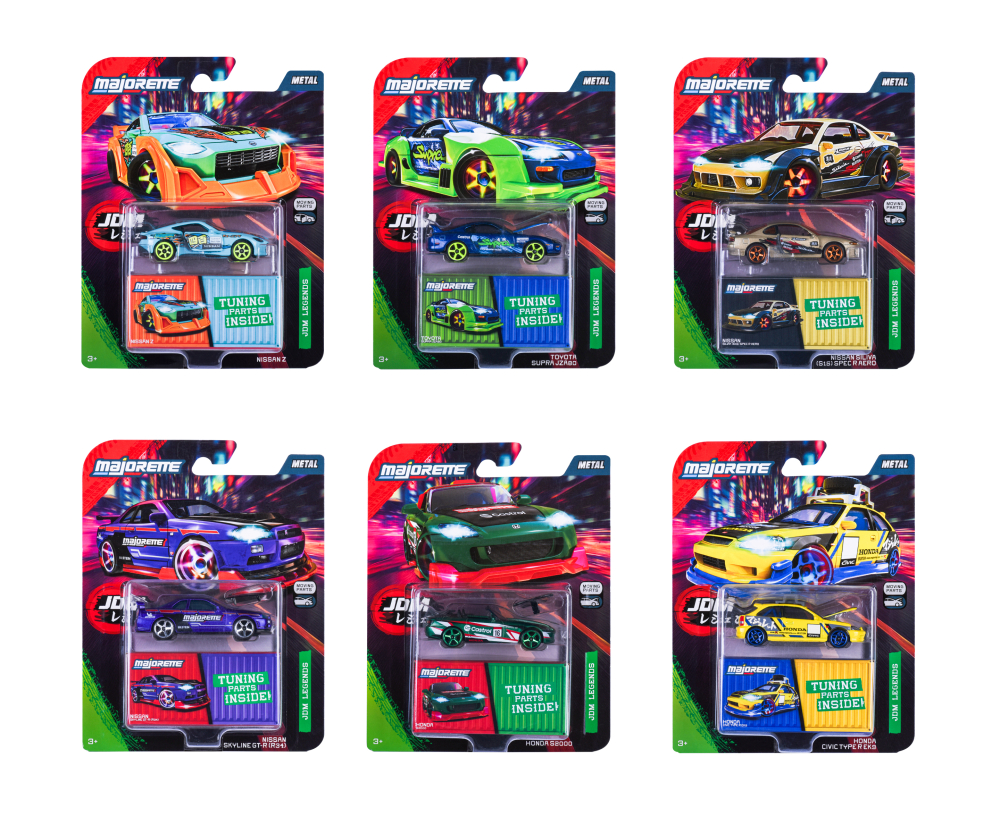 La passione per il tuning giapponese prende vita con Majorette JDM Legends, una collezione di auto sportive ispirate alle icone della scena JDM. Ogni modellino in scala 1:64 (circa 7,5 cm) è realizzato in metallo pressofuso, con ruote libere, sospensioni e parti mobili, per un’esperienza di gioco dinamica e realistica.