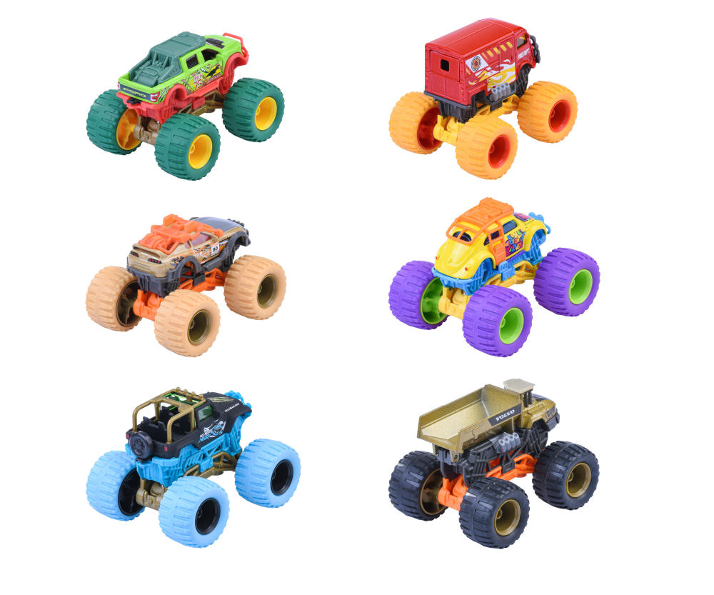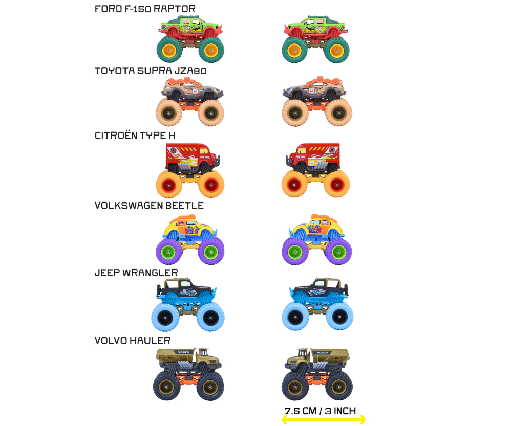 Colorati, folli ed emozionanti: questi mini monster truck regalano il massimo del divertimento su ruote oversize! Ognuno dei 6 modelli è una versione monster di un’auto iconica, con carrozzeria ufficialmente licenziata di marchi come Jeep, Volvo, Ford e altri. Le livree sgargianti e le decorazioni selvagge rendono ogni veicolo un pezzo unico, impossibile da ignorare.